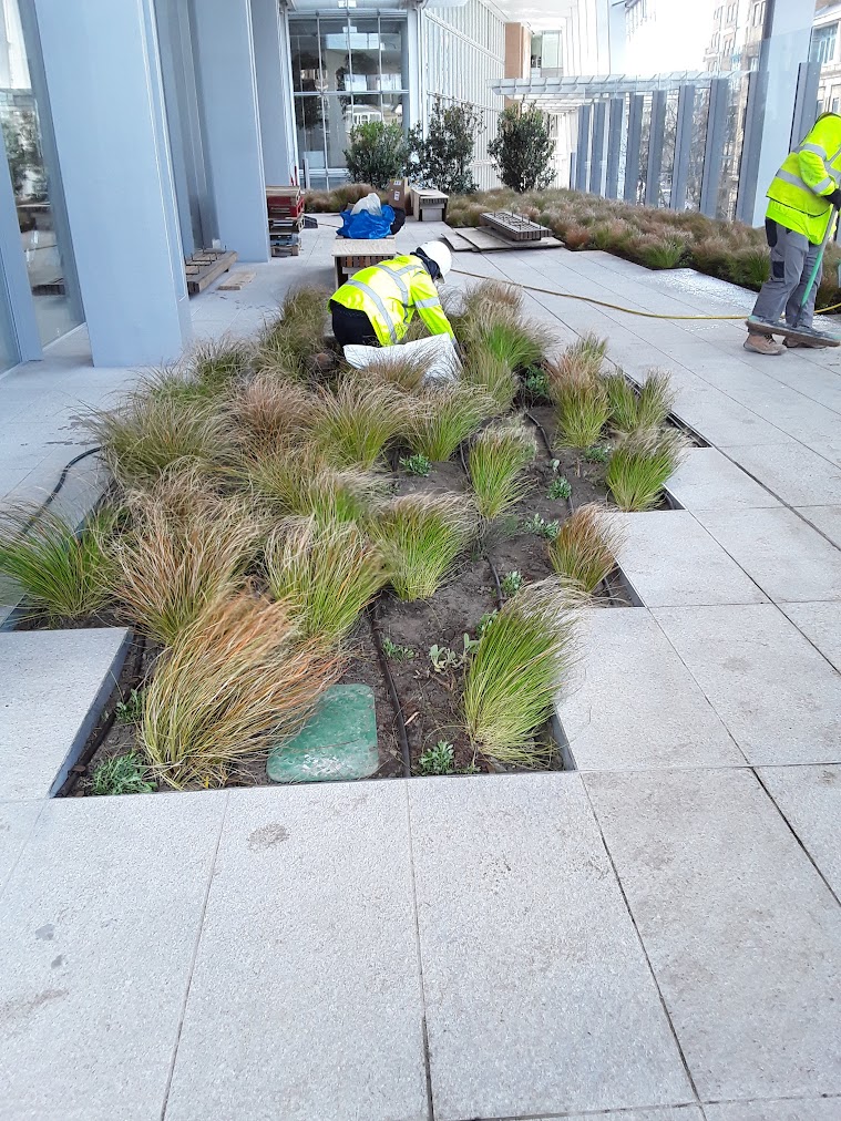 With planting spread across elevated terraces and podium levels, the landscape needed a reliable, low-maintenance solution that would keep the landscape healthy year-round—an essential requirement for any high-end landscape design or urban planting scheme.